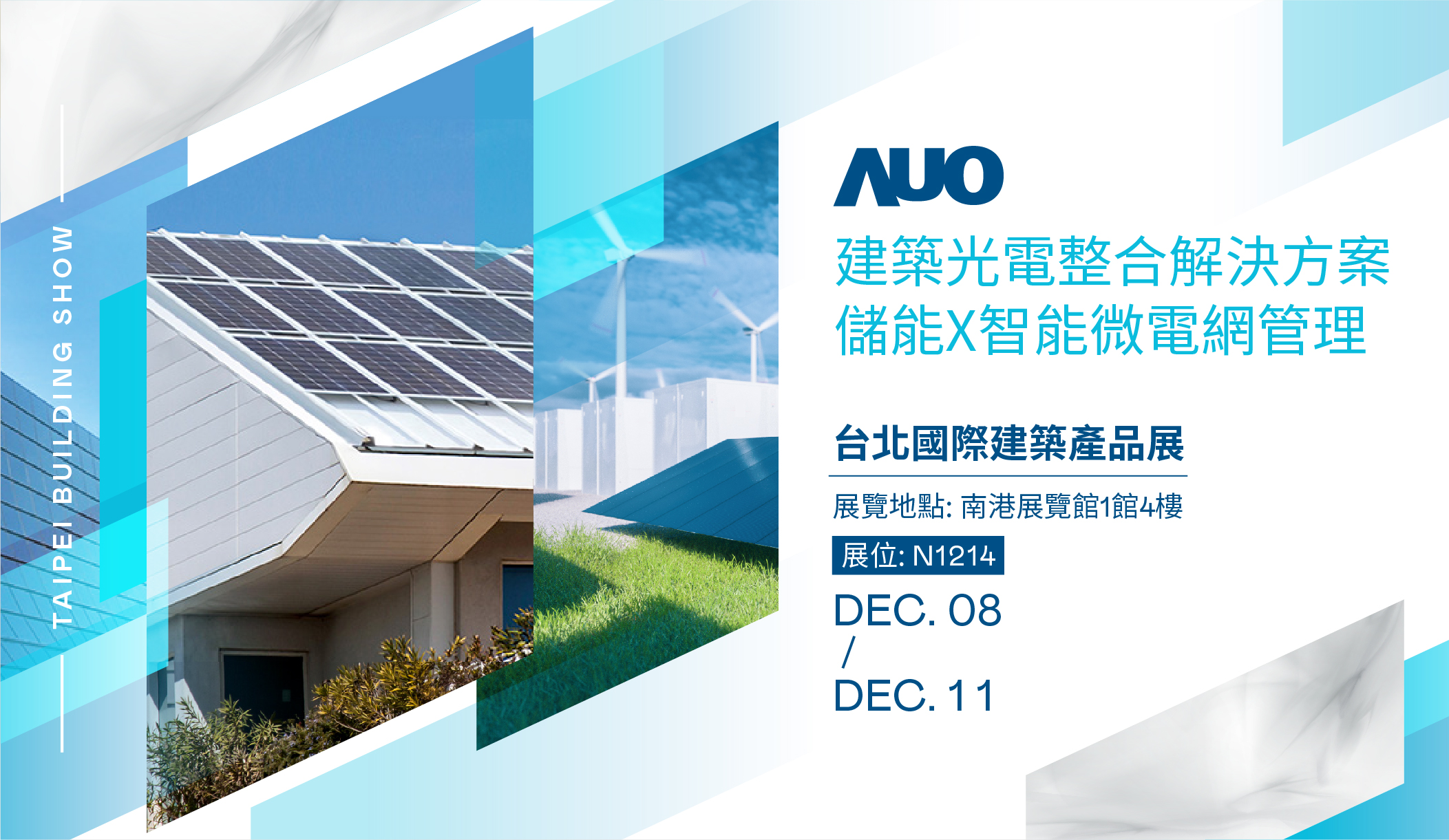 友達將參加12月8日至11日於台北南港展覽館4館舉行之「Taipei Building Show 2022 台北國際建築建材暨產品展」。今年友達展出一系列建築光電整合型模組 x 儲能 x 智能微電網管理技術,包含「光電浪板一體化建材」、「可撓輕量光電模組」、「家用儲能微電網」和「全時綠能」等主題,致力於提供「近零耗能的光電建築整合解決方案」。此外,展覽期間舉辦攤位導覽活動,帶您一覽友達深耕再生能源的豐碩成果。